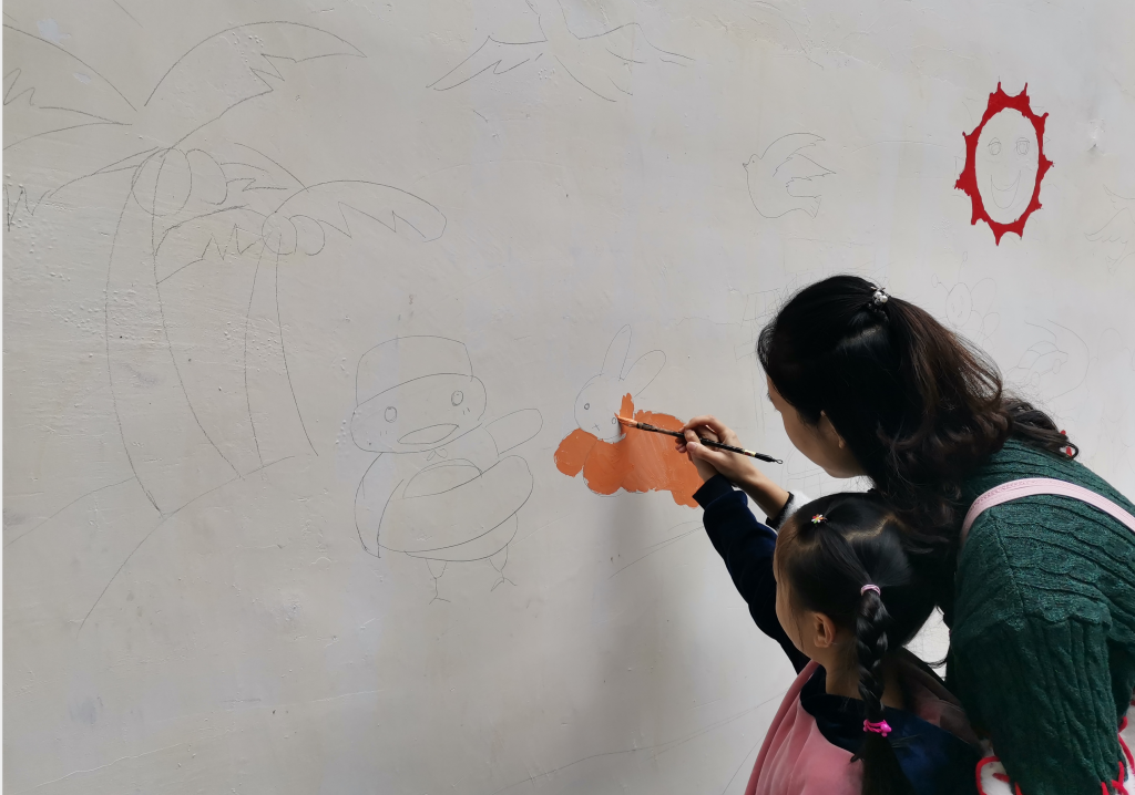 本次志愿服务活动主要分两个板块,即“墙绘活动”和连心苑社区趣味活动。在“墙绘活动”中,志愿者在美术老师的指导下,先在社区一块空白墙壁上勾出卡通人物、房子、树木、汽车等简笔画,协助社区小朋友进行图画填色。趣味活动环节,志愿者主要进行义诊、垃圾分类游戏、拼图游戏、制作泡芙和锅盔活动。