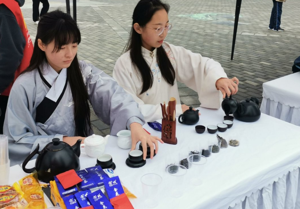 项目介绍完毕后,各高校团队分别进行以项目特色装饰设点活动。在茶文化项目点,有双语志愿者对中国博大精深的茶文化进行讲述,并设有精致典雅的茶艺表演以及转陀螺、踢毽子等游戏,还能品鉴各大茶类,吸引了大批居民前来参与。过程中,志愿者耐心地为居民、高校学子及职工讲解茶文化和茶饮、茶保健养生知识。
