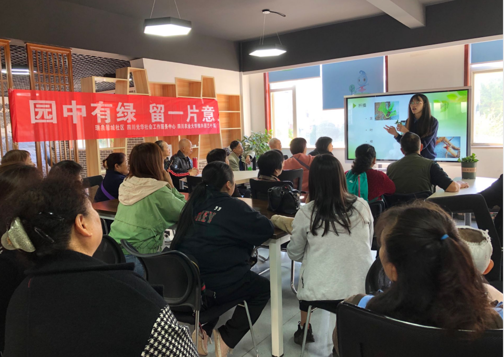 10月28日,学院青年志愿者在雅卉小组研究生山诗瑶带领下前往瑞泉馨城活动中心进行“园中有绿,留一片意”活动第一期,给社区老人讲解盆景相关知识。