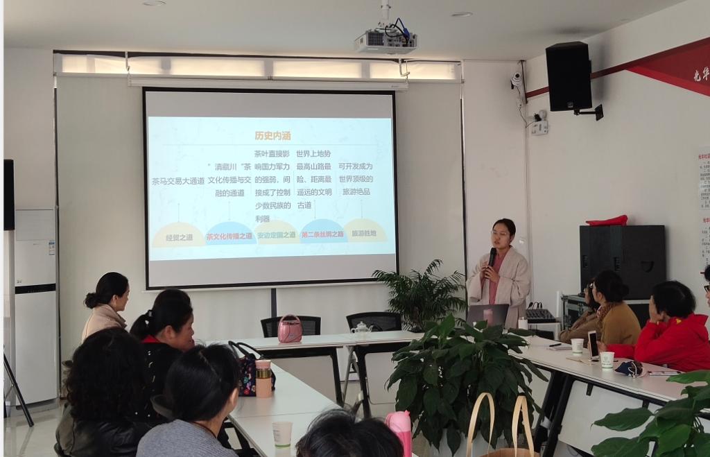 茶学专业青年志愿者廖思雨介绍了茶马古道历史渊源以及茶马古道及沿途古代发展状况,讲解了辨别紫砂壶优劣的技巧以及紫砂壶的使用方法。接着,廖思雨与社区老人进行了本次课程心得的分享,过程中,老人们对茶马古道历史表现出了极大的兴趣。她还询问了老人们对茶有哪些更多方面的兴趣,并邀请老人下次课堂带一款自己喜欢的茶进行交流分享。期间,其余志愿者在现场冲泡优质雀舌,与老人们一同品鉴交流。老人们还主动与主讲人廖思雨探讨了课堂的改进,提出了自己的见解,希望茶文化课堂可以继续开展下去。