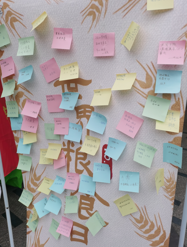 活动前期通过官Q等多媒体平台进行线上宣传,当天9:00至下午4:30在食堂小广场进行轮流值班,对来往的同学积极宣传世界粮食日并倡导大家节约粮食,并邀请同学们在宣传海报上签下自己的名字或者写下一段关于节约粮食的话。看着丰硕的成果,志愿者脸上挂满了笑容,相信这些贴满的小纸片宣言一定会使更多的人了解世界粮食现状并响应国家节约粮食的号召。