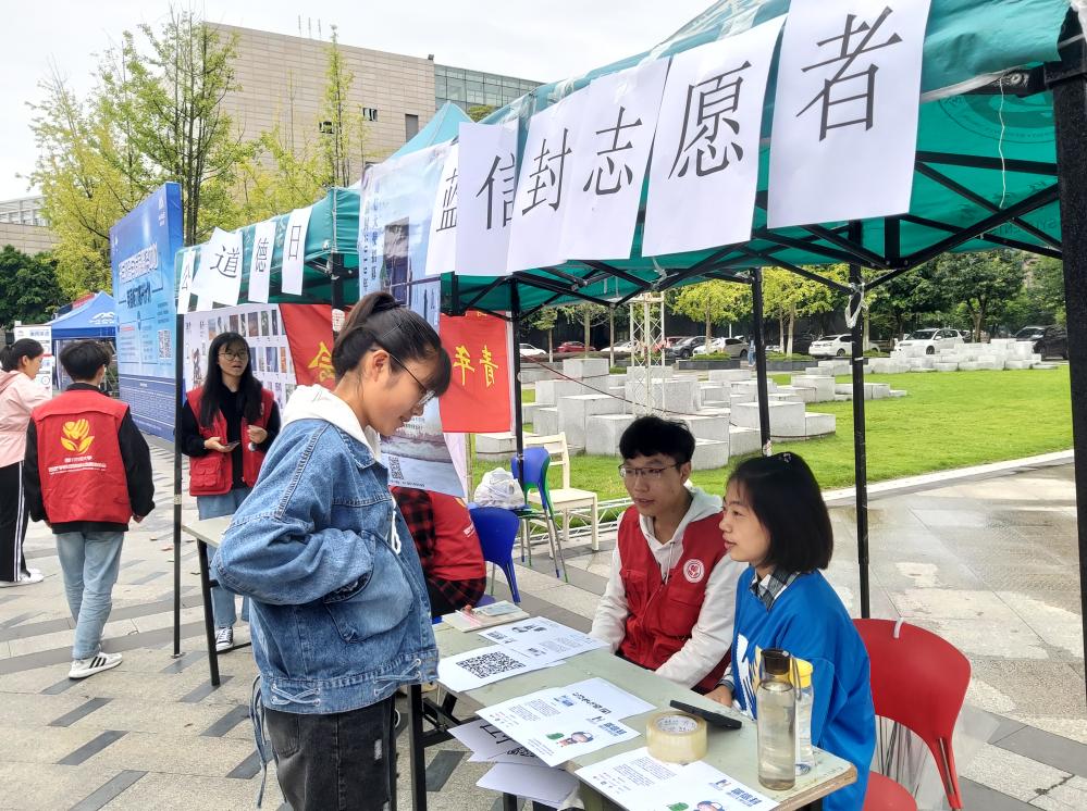 中午时分,志愿者在食堂小广场进行线下设点宣传,简单向路过的同学们介绍蓝信封行动的主要内容、项目实施模式和报名流程。本次宣传以与留守儿童的“书信来往”和“寻笔友”为宣传点,吸引了大量同学前来咨询。