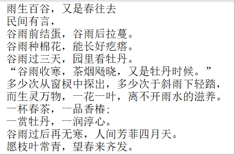 谷雨取自“雨生百谷”之意,是春季最后一个节气。谷雨后,气温逐渐升高,降雨量增多,空气湿度进一步加大,是农作物生长的最佳时节。汉朝《通纬·孝经援神契》中说:“清明后十五日,斗指辰,为谷雨,三月中,言雨生百谷,清净明洁也。”这是先民对于谷雨节气最直观的总结,既有春雨生出芳草谷物的昂扬绿意,又有雨洗山川后的清净明洁。