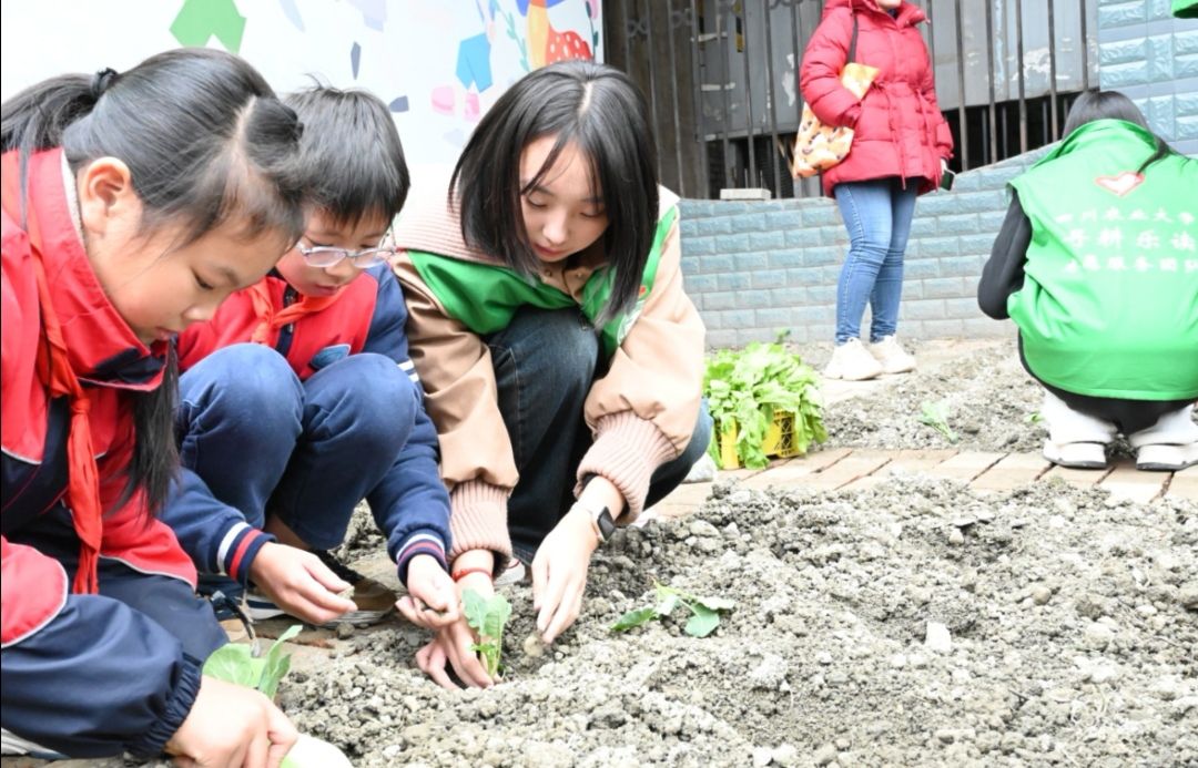 寻耕乐读哈哈体育志愿服务团队在开园仪式上带领员工播种