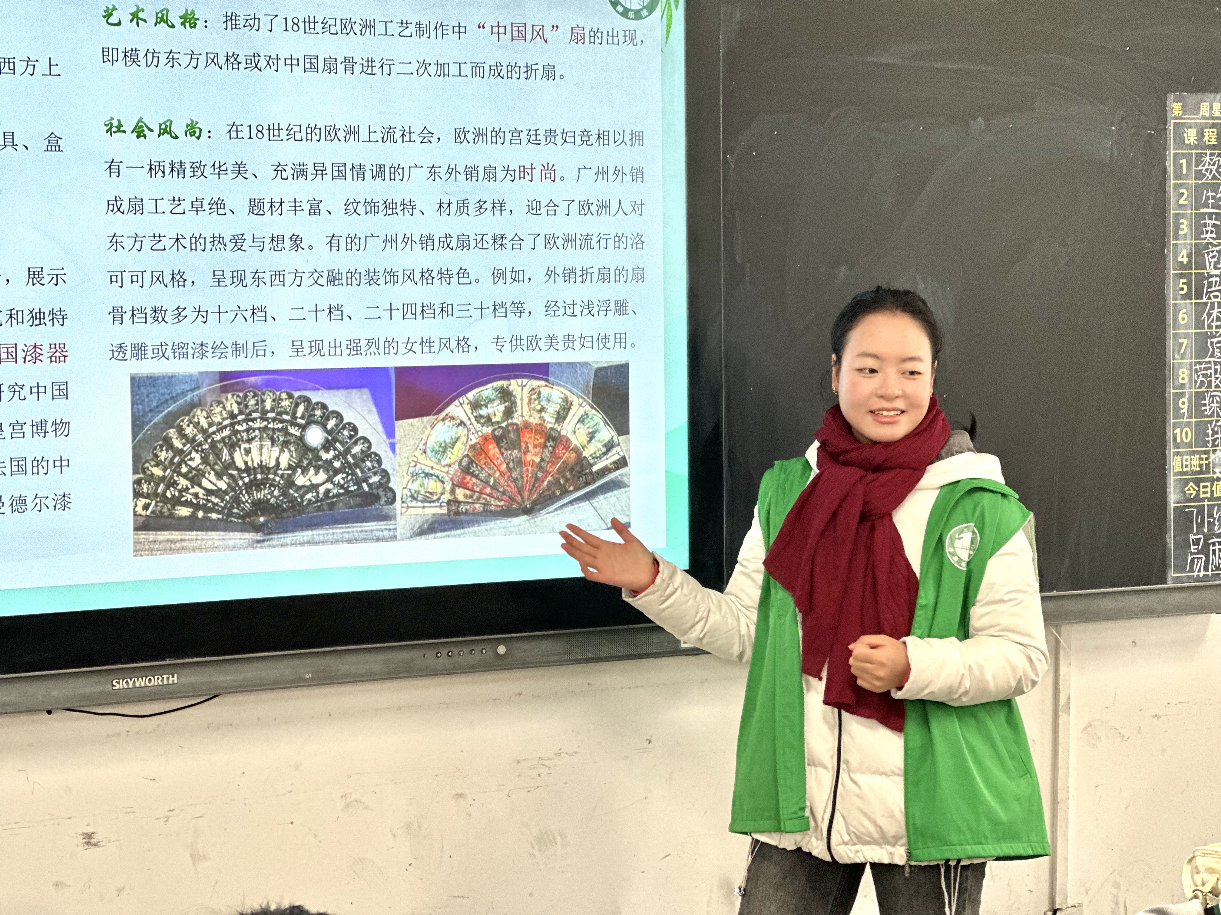 志愿者首先介绍了漆扇的历史源流、制作工艺及文化意义。从漆扇的起源,到其在不同时期的发展演变,以及现代的传承状况,内容丰富且详尽。同时,志愿者还讲解了漆扇制作工艺,包括材料选取、髹漆步骤、装饰手法等,让员工们对漆扇的制作过程有了初步的了解。