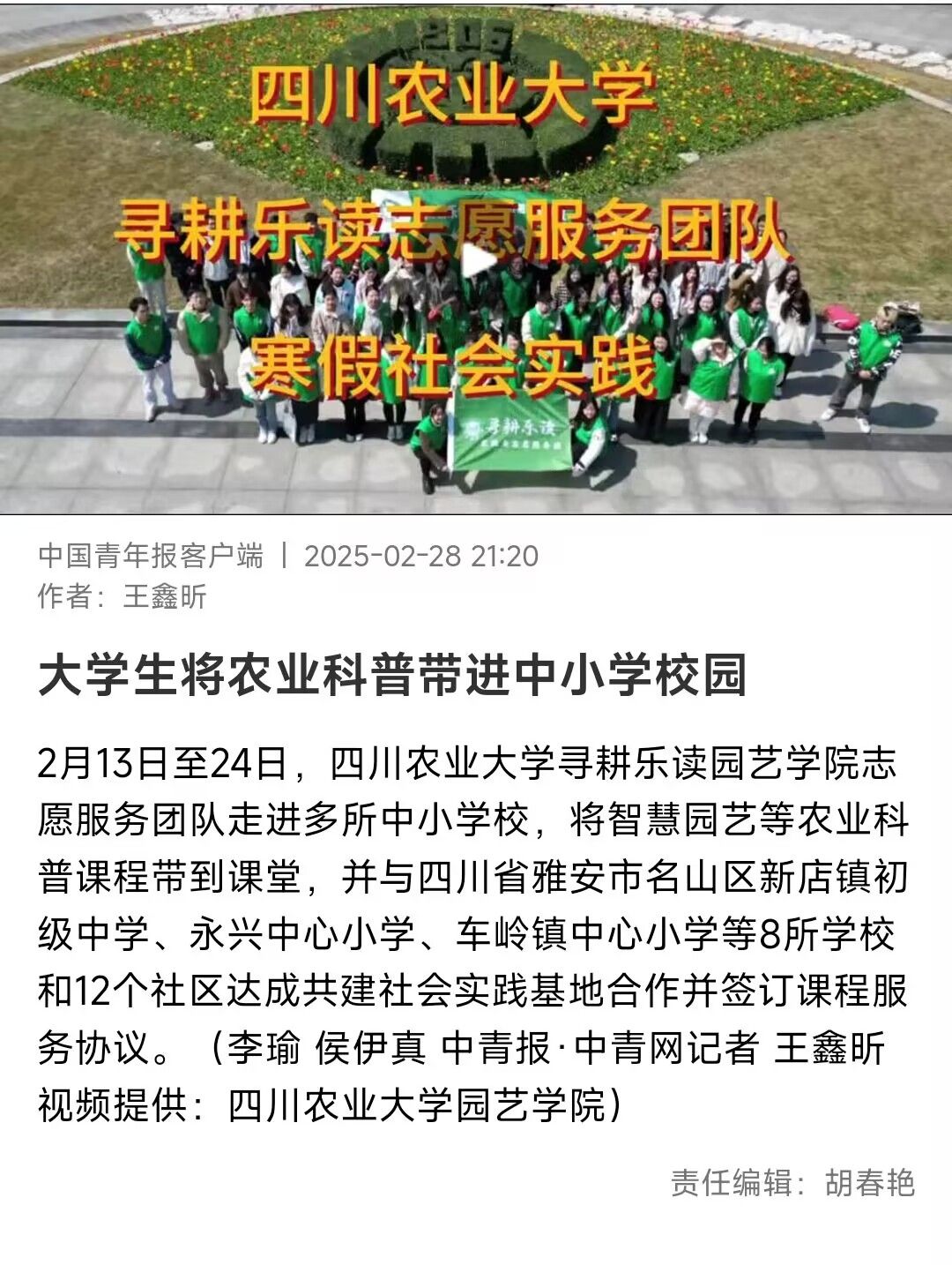 2月13日至24日,哈哈体育寻耕乐读哈哈体育志愿服务团队走进多所中小学校,将智慧园艺等农业科普课程带到课堂,并与四川省雅安市名山区新店镇初级中学、永兴中心小学、车岭镇中心小学等8所学校和12个社区达成共建社会实践基地合作并签订课程服务协议。(李瑜 侯伊真 中青报·中青网记者 王鑫昕 视频提供:哈哈体育)