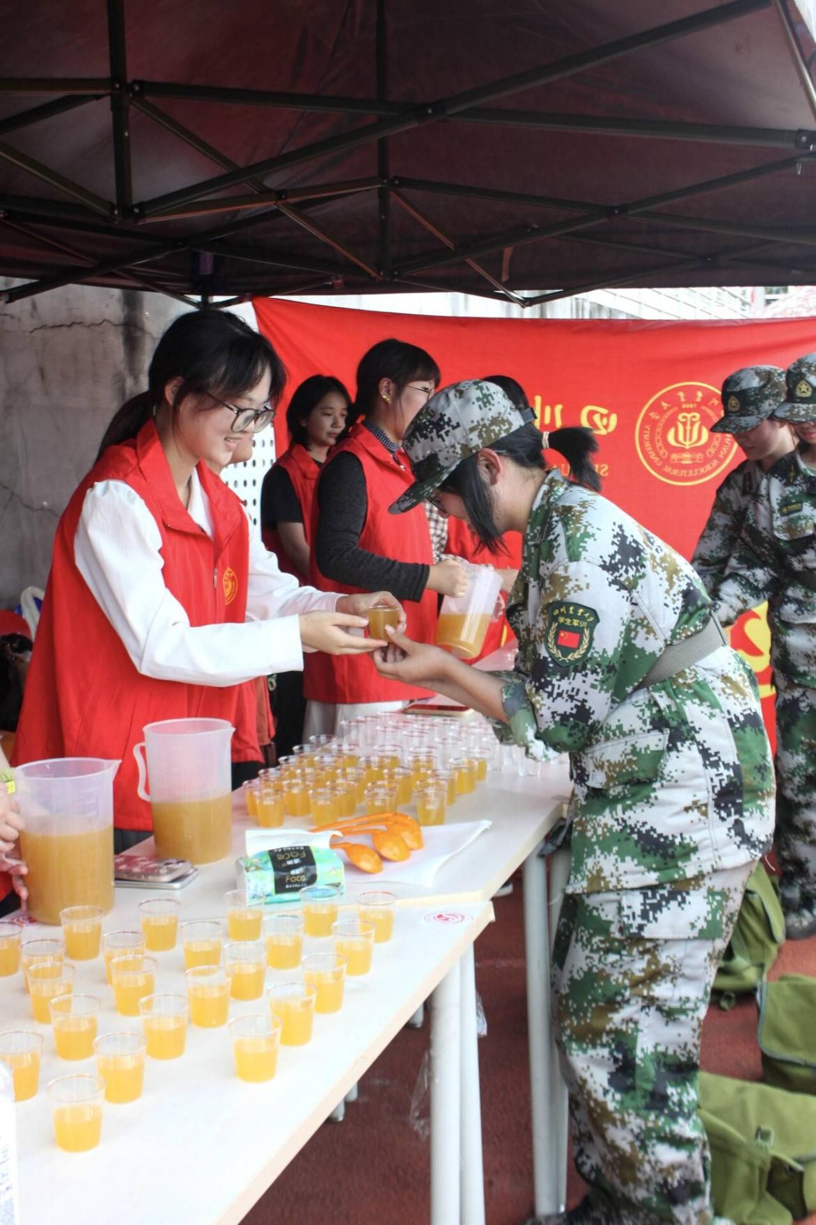活动中,学院员工组织主席团成员还结合学院专业特点,使用新鲜水果和优质茶品亲手制作了清凉解暑的果茶。从水果遴选,到清洗、切块、榨汁,调制,每一步都体现了高年级员工们对新生们的照顾与关爱。新生们接过清甜的果茶,脸上全都洋溢着喜悦的笑容。有新生表示:“喝了这杯果茶,训练的疲惫都减少了许多,今后将以更饱满的热情投入到后续训练和学习当中去,不辜负学院对我们的期望。”