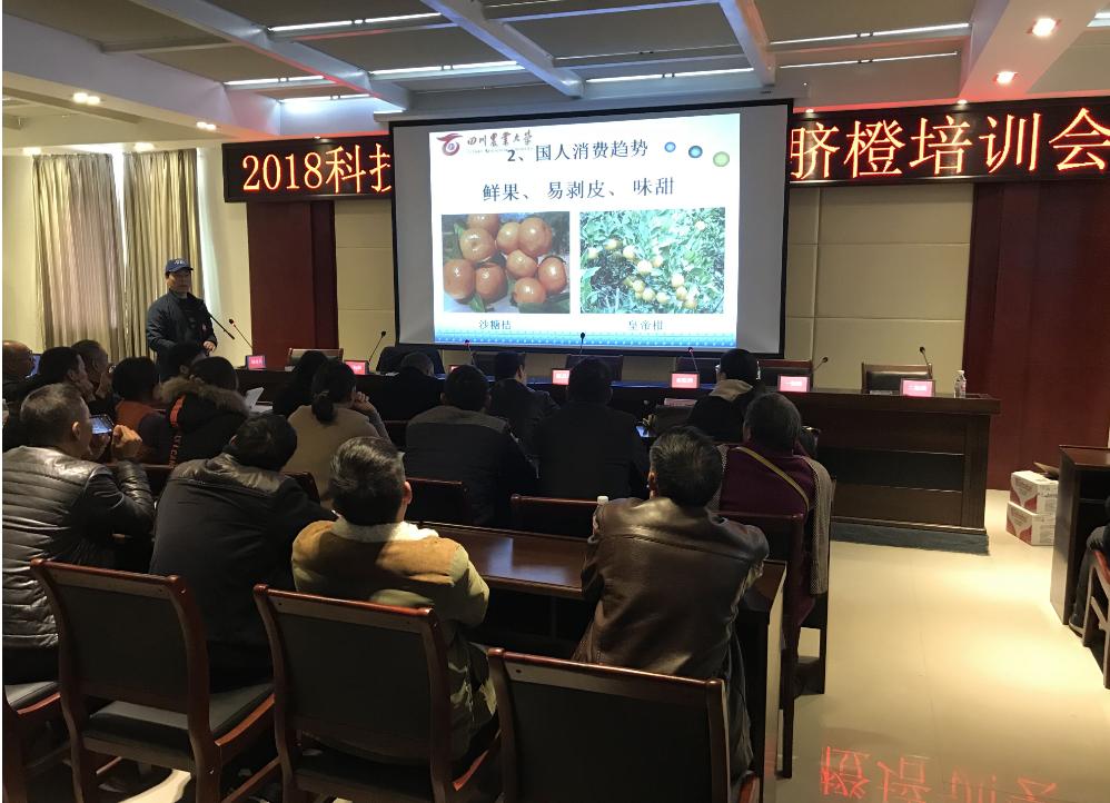 在田间现场指导的基础上,汪志辉教授等还在县农牧局会议室为农牧局工作人员、全县果农代表和合作社技术人员130余人进行了柑橘栽培技术培训。培训内容包括新品种介绍、土肥水管理、病虫害防治和花果管理等方面。通过此次集中培训进一步提升了雷波县脐橙从业人员的栽培技术水平和经营理念。