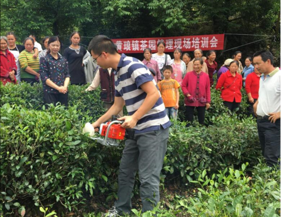 培训会围绕茶园树冠的科学管理、机械修剪技术和茶树修剪机使用三方面展开。针对前期调研发现黄琅镇茶园管理粗放,特别是茶树树冠管理技术十分落后,导致茶园产量低、品质差,加之茶园完全采用人工修剪,不仅耗时耗力,且效果欠佳的问题。会上,唐茜教授就如何培养高产优质的茶树树冠、不同类型茶园修剪技术和操作要领进行了深入浅出的讲解,对修剪机的使用和保管、维护提出了建议。