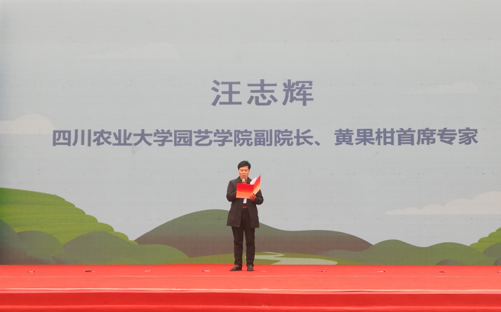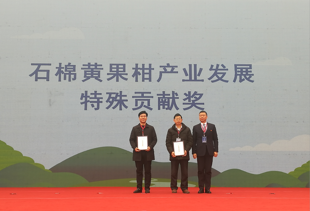 自2007年石棉县与公司开展校县合作以来,汪志辉教授率领团队致力于黄果柑提质增效的研究,特别是2010至2012年下派挂职石棉副县长期间,通过梳理石棉黄果柑产业思路,分析其在发展过程中存在的瓶颈问题,对症开展工作,经过其本人及团队的努力,提升了黄果柑的品牌价值,对当地黄果柑的产业发展做出了突出贡献。当天的活动中,中国扶贫基金会向汪教授颁发了石棉黄果柑产业发展特殊贡献奖。他也作为石棉县黄果柑首席专家做了黄果柑现场推介,从黄果柑三大特点,即特晚熟、花果同树、极丰产角度向与会嘉宾阐述了石棉黄果柑的优势。