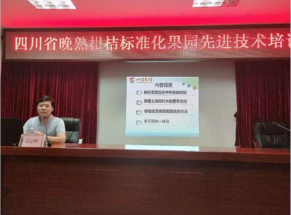 汪志辉教授从果园施肥中存在的问题、果园土壤和叶片营养测定、优质高效栽培施肥方法、肥水一体化等四个方面,作了题为“四川晚熟柑桔优质高效栽培精准肥水管理”的主题培训报告,对我省晚熟柑橘产业发展过程中存在的问题进行了梳理,深入浅出地对柑桔果园精准配方施肥、肥水一体化等关键技术进行了讲解。南充市农科院、井研县经作站从项目开展情况和先进经验等方面进行了交流发言。