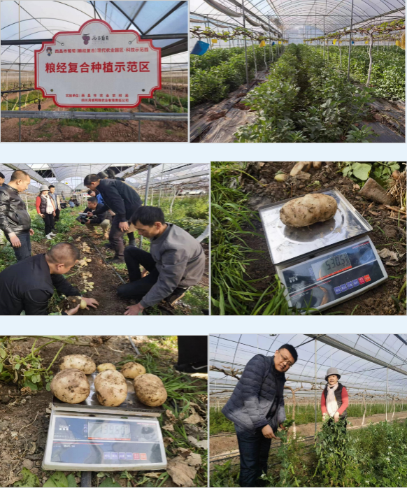 当天由公司和西昌市农业农村局以及成都市农林科学院等单位的领导、专家组成专家组对西昌市太和镇太安村的“葡萄+马铃薯”粮经复合种植示范点进行了现场考察和测产。该示范点于2022年9月底在种植葡萄的垄面行间播种了马铃薯品种丽薯5号与青薯9号。专家组选取有代表性的“葡萄+马铃薯”地块进行测产。显示该示范点马铃薯最大单粒重530.5克,单株最高产量1039克,平均亩产达到1650斤/亩,按市场价1.5元/斤计算,亩产值达2475元,在果农实现葡萄增收的同时提升了土地利用效益。该示范点另一个创新之处在于在种植过程中,无需单独为马铃薯施用肥料,利用葡萄园地原有的丰富有机质及水肥一体化滴灌系统即可满足其正常生长需求,构建了葡萄与马铃薯套种的营养共享新模式,实现了“葡萄+马铃薯”粮经复合种植的省力化、轻简化与丰产化。此外,该示范点内的间栽豌豆与蚕豆植株生长健壮、长势良好,其中豌豆结荚丰富、颗粒饱满,蚕豆正处于盛花阶段。截至目前,“葡萄+马铃薯”、“葡萄+豌豆”及“葡萄+蚕豆”粮经复合种植模式在西昌市辐射推广面积已达14000余亩。在保障粮食安全的基础上,助农增收,助力乡村产业振兴。