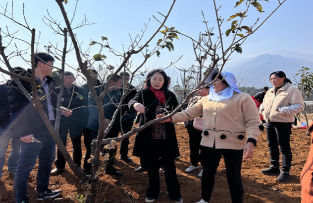 培训前,樱桃专家团在佳润农产品经营公司李总陪同下前往西昌市樟木箐镇鼻马村樱桃新品种绿色优质栽培关键技术示范基地调查指导,王小蓉教授并根据基地情况,对田间肥水管理不善、整形修剪粗放等问题给出了樱桃越冬生产管理建议。随后,王小蓉教授在樟木箐镇丘陵村开展樱桃协同推广培训会上,介绍了樱桃新品种、新技术和新模式一体化融合,实现樱桃绿色优质高效生产,并与学员分享了冬季清园步骤、田间管理等生产栽培管理技术精要。团队成员陈清教授和陈涛副教授在果园针对冬季樱桃树整形修剪,依据“调整树体结构,平衡树势;调控结果枝组,合理挂果”的原则进行了现场指导和操作示范。