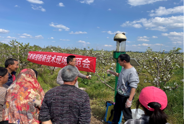 目前正值梨花授粉关键时期,天府新区籍田街道千亩梨园存在人工点粉成本高、花期不统一及自然授粉质量低等问题,急需解决提高授粉效率及效果等问题。在示范现场,张勇教授首先介绍了液体授粉技术的原理及使用要点和注意事项。成都市农技推广总站农艺师王强对液体授粉技术进行了现场演示。
