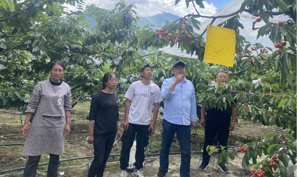 在汶川县威州镇布瓦村和麦通村的专业合作社基地,专家一行详细查看了甜樱桃、李等果树长势,根据现场发现的问题,从避雨、水肥调控、病虫防治等方面对中晚熟和高海拔甜樱桃后期管理提出了多项建议,还详细讲解了李子目前需要开展的疏果、施肥和病虫防治等夏季管理技术要领。专家一行还调查了本团队从国内外引进的20余个甜樱桃新品种的结果情况,并根据近两年的结果情况初选出5个品种拟进行推广。