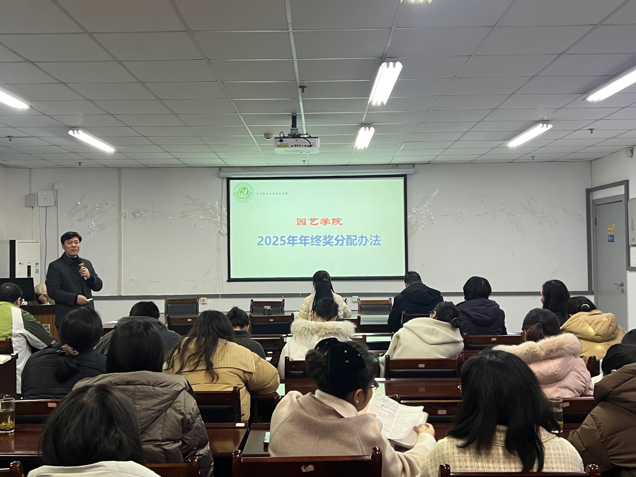 党委书记袁志香回顾了过去一年中,全院教职工在公司党委的坚强引领下,锐意进取,围绕“十四五”规划任务和一流学科专业建设,圆满完成学院各项事业和取得的成绩;高度评价了教职工们的辛勤耕耘与无私奉献,并深情寄语。袁志香还对学校十一届党委第八轮巡察的意见反馈向全院教职工做了简要介绍,并相关整改的整体工作的部署做了说明,希望全院教职工,尤其是各教工党支部要以巡察整改为契机,凝心聚力,携手并进,助推高质量党建引领学院高质量建设发展。此外,袁志香还就下一步如何落实好2025级园艺专业员工全员导师制和2026届毕业生工作做了强调。