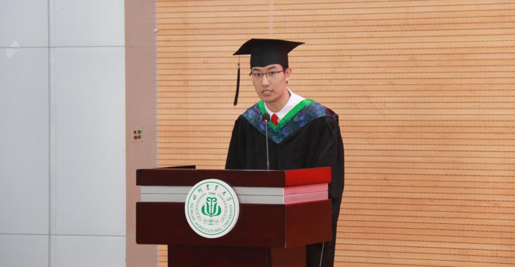 茶学系青年教师胥伟博士作为教师代表讲述了自己和母亲、园艺之间的故事,语言风趣,热情洋溢,对即将毕业的同学们的未来表示了祝贺和期待。园艺专业毕业生刘鑫睿同学首先对养育自己的亲人、培养自己的学校和老师以及时常帮助自己的同学表示了由衷的感谢。讲述了自己从迷茫,到明确方向努力拼搏,最终依靠创新创业升入四川大学攻读硕士研究生的故事,代表毕业生们对学校、学院表达了浓浓的不舍,对一起毕业的同伴们表达最真诚的祝福。