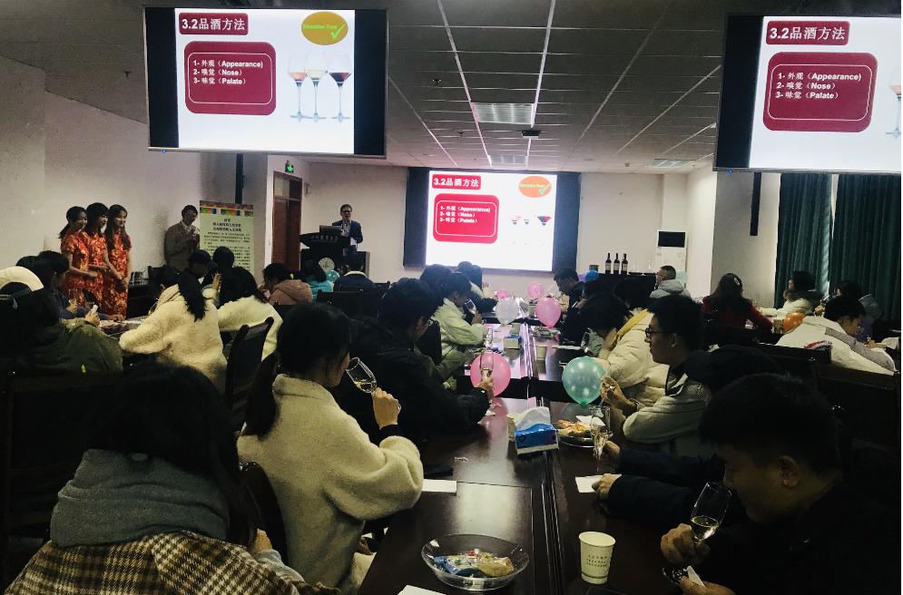 12月6日,由哈哈体育团委主办,团委创新创业部承办的哈哈体育“‘葡’写园艺,成长你我”创新创业沙龙暨品酒会分别在麦立方和西康楼举行。活动设分享会、座谈会、双创赛事颁奖典礼和品酒会四个环节。其中前三个环节在麦立方进行,品酒会在西康楼209举行。活动特邀成都川农牛科技有限公司创始人袁斌、英国WSET高级品酒师李勇两位嘉宾以及获得创新创业国家和省级赛事奖励的学院2017级罗浩天、刘鑫瑞进行分享。公司党委书记袁志香,各系负责人、党委行政办公室老师和创新创业指导教师代表参加活动,活动还吸引了学校500余名员工参与。