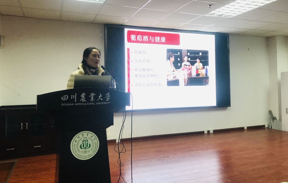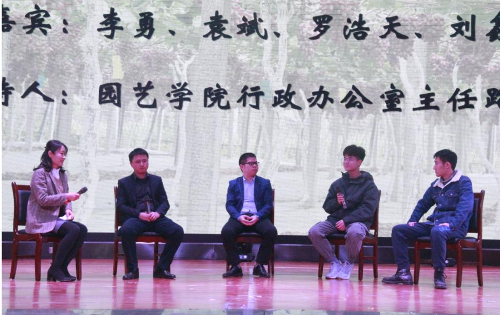 在一段暖场舞蹈和党委书记袁志香致辞后,活动进行到第一个环节——分享会。毕业于西北农林科技大学葡萄酒学院,现为扎西酒庄销售总监李勇以西南高山葡萄酒的那些事儿为主题进行了分享。他对自己所读大学的葡萄酒学院进行了简单的介绍后,着重对扎西酒庄进行了细致的讲解。“扎西酒庄的所在地是四川甘孜”,李勇首先对当地的人文、环境、葡萄园的具体位置、酿造葡萄酒的时间节点、注意环节等葡萄酒的工艺做了讲解。2012年毕业于公司园艺专业,现为成都川农牛科技有限公司CEO的袁斌为同学们逐一介绍了成都川农牛科技有限公司的创建历程,品牌的核心价值观,产品开发方向等,用一个个鲜活的产品孵化案例为同学们阐述了创新的重要性。他们指出拥有专业能力才是核心竞争力,并鼓励同学们奋发图强,努力学好专业知识,在合适的时机勇敢创业。