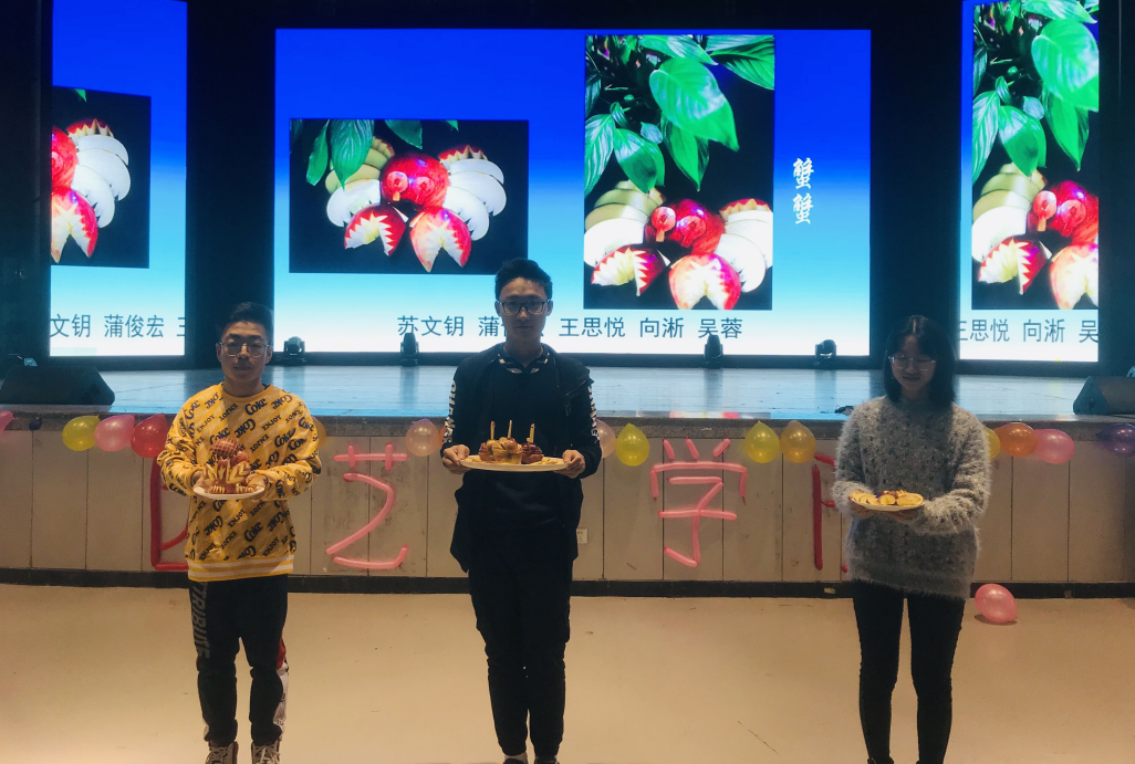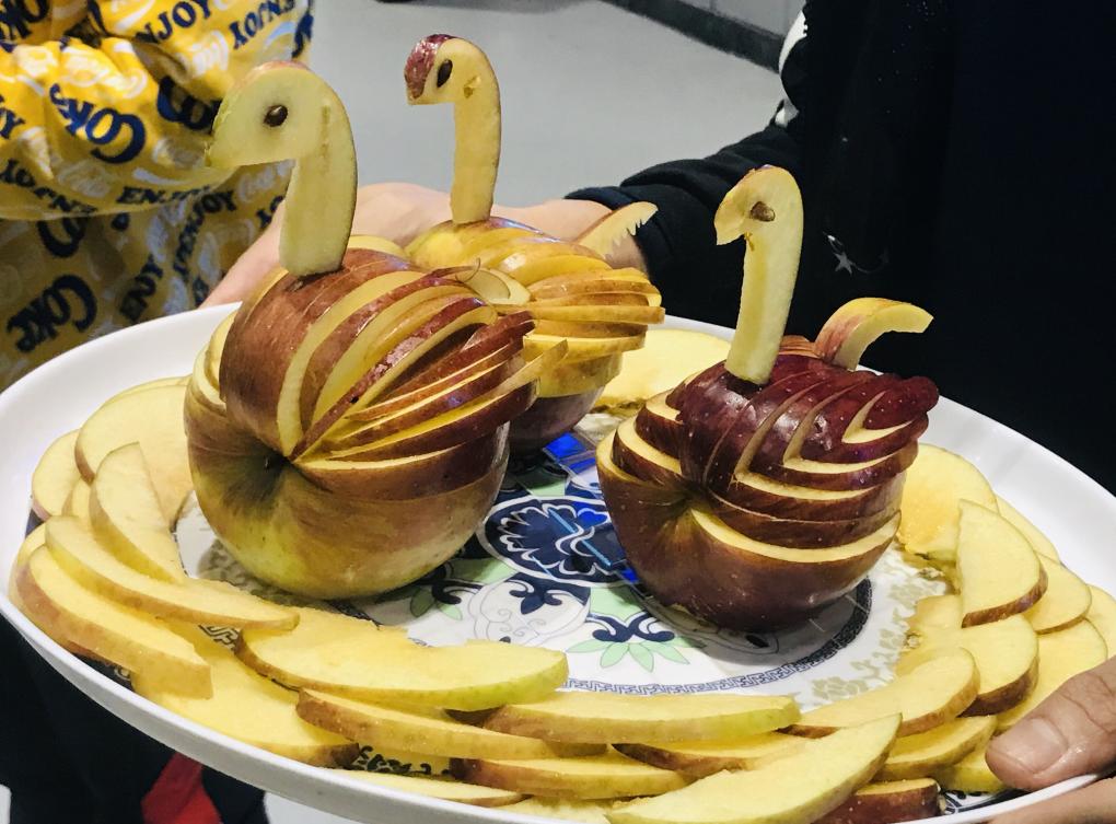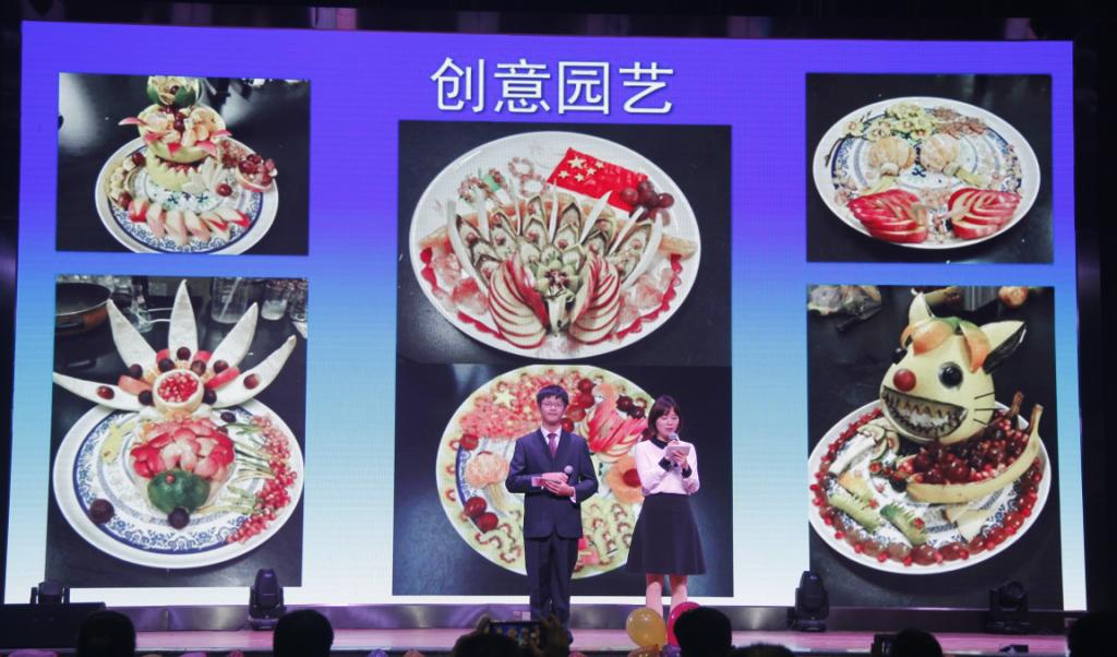 在创意展示环节,同学们将汉源糖心苹果变为各种艺术品,让与会领导和嘉宾叹为观止。龚荣高教授还就糖心苹果糖心的形成向在场的嘉宾和师生作了科学地分析和介绍。
