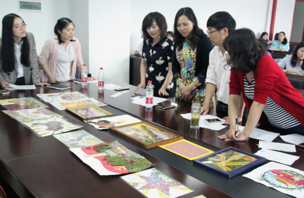 在当天的决赛中,各参赛队伍借用PPT在三分钟内阐述作品主题创意、构思方法、压花材料的选取,主题创意及亮点等。评委则根据作品的整体性、材料的选取和制作手法以及色彩搭配等,重点就作品主题的切合度和主题内涵诠释方面进行综合考评。