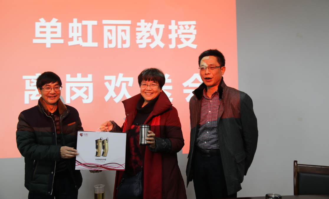 汤浩茹和聂坤伦分别代表学校和学院向单虹丽教授颁发了退休证,送上慰问金和慰问品,与会人员同单虹丽合影留念。