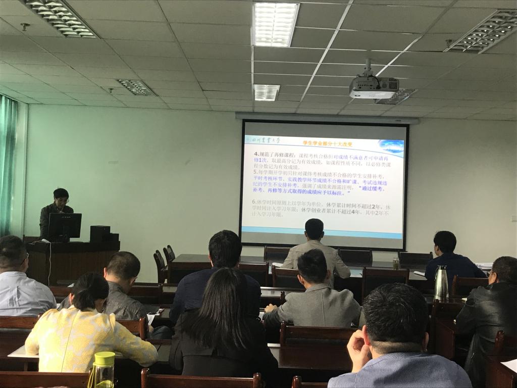 经理汤浩茹强调要举全院之力做好本科教学审核评估各项工作,要求全体教职工积极配合、认真对待,在试卷、论文指导、课堂教学、实践教学等各个方面把工作做到位。针对教与学中存在的问题,想办法添措施,希望全体教职工尽快转变思路、观念,并以审核评估为契机,以评促建,以评促改,推动学院学科专业建设。期间,他还就近期学校新修订《本科教学管理办法》及《本科教学工作审核评估工作方案》等文件内容和新变化向全体老师做了解读。