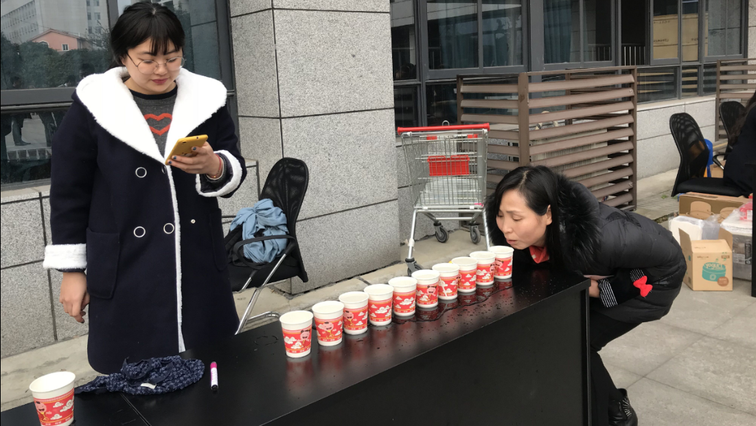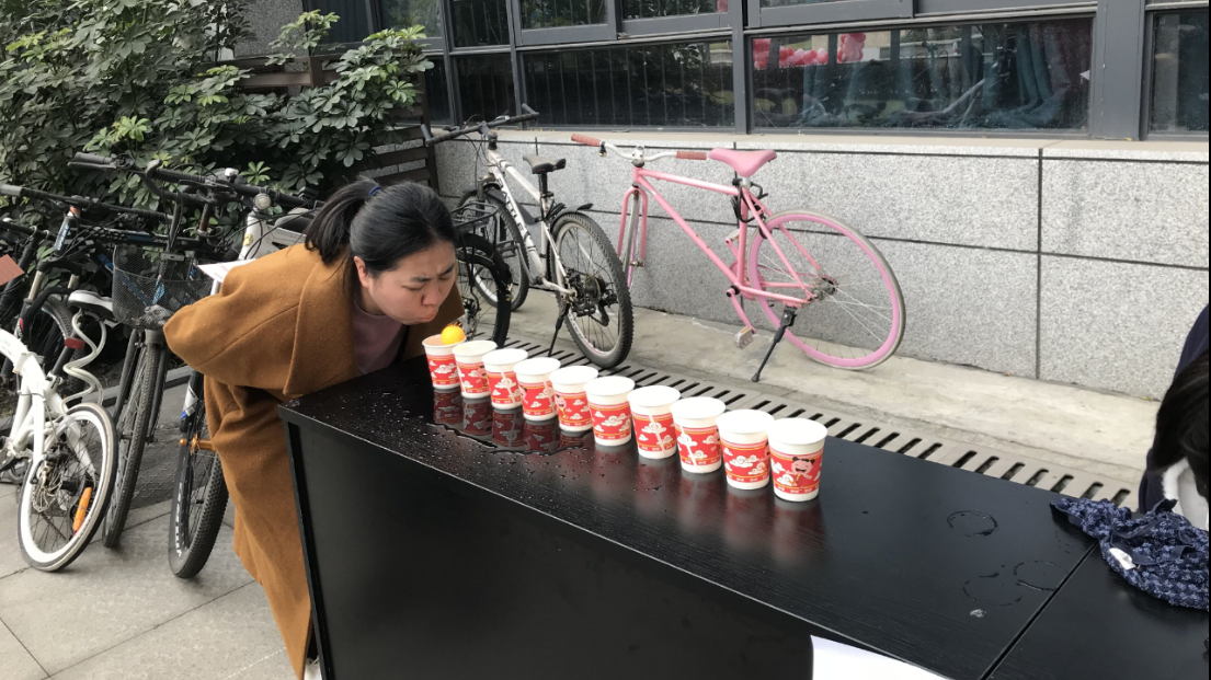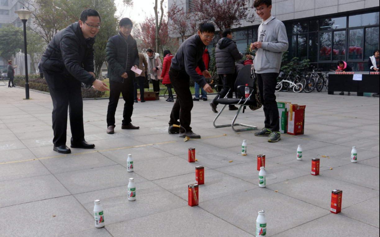 当宣布活动开始后,“一气呵成”、“筷进瓶中”、“海底捞月”、“正字反写”、“小李飞镖”、“弹球”、“圆圆满满”7项个人项目迅速聚集了人气,“海底捞月”处尤为热闹,参与者们需用筷子夹起水容器中的弹珠,成员们几次“小试牛刀”下来,相互交流,传递经验,很快便找到通过诀窍;团体4项游戏处更是热闹非常,“掌上明珠”、“巧搬气球”、“齐心协力”、“毽子接力”大家两两邀约,相互协作,快速到达终点,在赢得比赛、收获奖券获得自己“心意”奖品的同时,更获得运动带来的乐趣。大家还围在获得本次游园活动大奖的果蔬所王迅周围“沾喜气”。