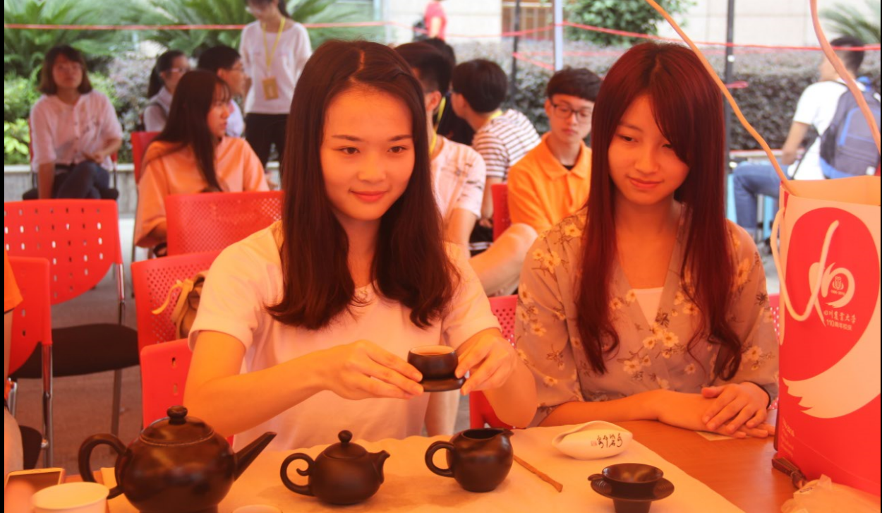 纵周遭喧闹,她独静一隅。一盏盏清茶,递于过往新生及陪同亲属,润其喉,解其渴,亦洗其一路旅尘。和煦的微风拂顺他们因旅途奔波而稍显杂乱的发梢,校园的沿途风光及学长学姐的热情抚平他们刚入学紧张焦虑,随处可见的横幅海报对他们的到来表达着无声的热烈欢迎。