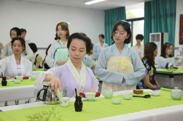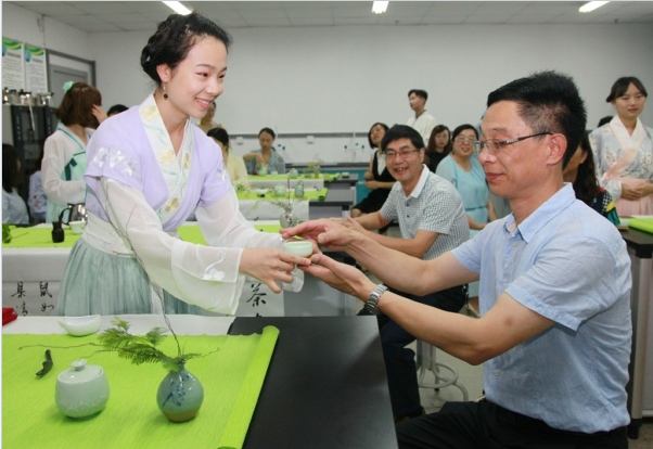 老师们陆续来到茶艺室,看见衣裙飘飘的同学们,不禁发出赞叹,更有老师拿出手机和同学们合影留念。
