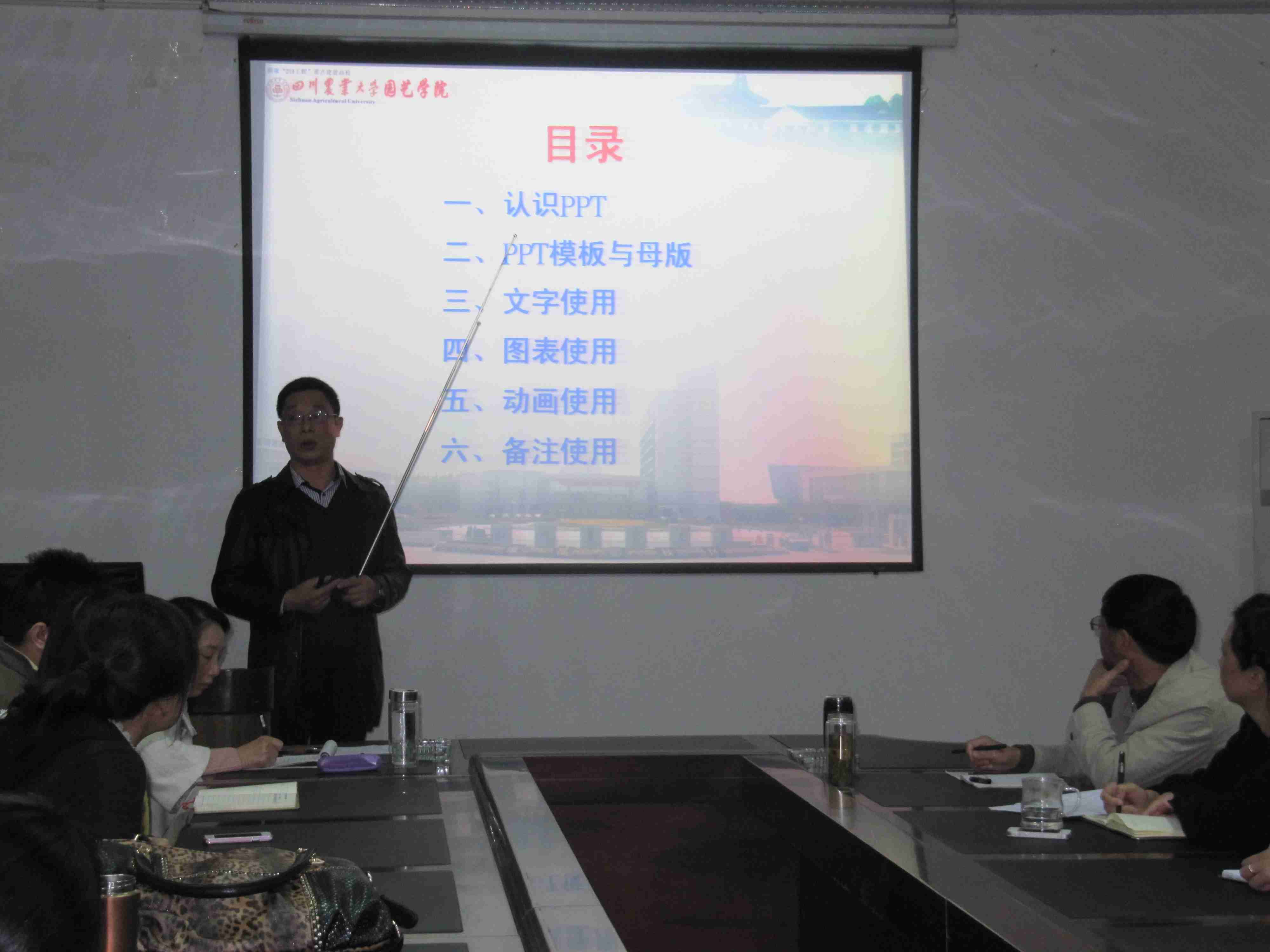 他首先阐释了演示文稿powerpoint(简称ppt)的基本含义,powerpoint =“power+point”可以理解为“重点+要点”,换句话就是制作的课件要把非常重要的要点反映出来,把文字、图形、图表、声音、动画等多种媒体素材在时间和空间两方面进行集成,使他们融为一体,使教学活动充满魅力。他认为多媒体课件只是辅助教学的工具,做多媒体课件的基本规范就是简化文本、控制文本大小、视觉平衡、避免糟糕图文编辑和保持版面设计简洁有力。他就教学过程中老师们可能忽略模板与母板的使用通过实例进行了重要性和必要性的阐述,建议老师们在制作课件之前要定位母版的界面风格,不要再中途更换模板,科学、实用、美观地多媒体课件能用字的不用图、能用图的不用表,使用文本框最好转换成图片格式,要充分利用备注页或者备注母版等。他结合实际教学经验还就字数、字体、字体大小、颜色、排版、图表、动画等在教学过程中经常使用的工具做了详细的讲解,对与会同志进行了全面的指导。他生动、贴近教学实际的讲解引起大家的共鸣,为进一步提升学院公司产品水平作了示范。