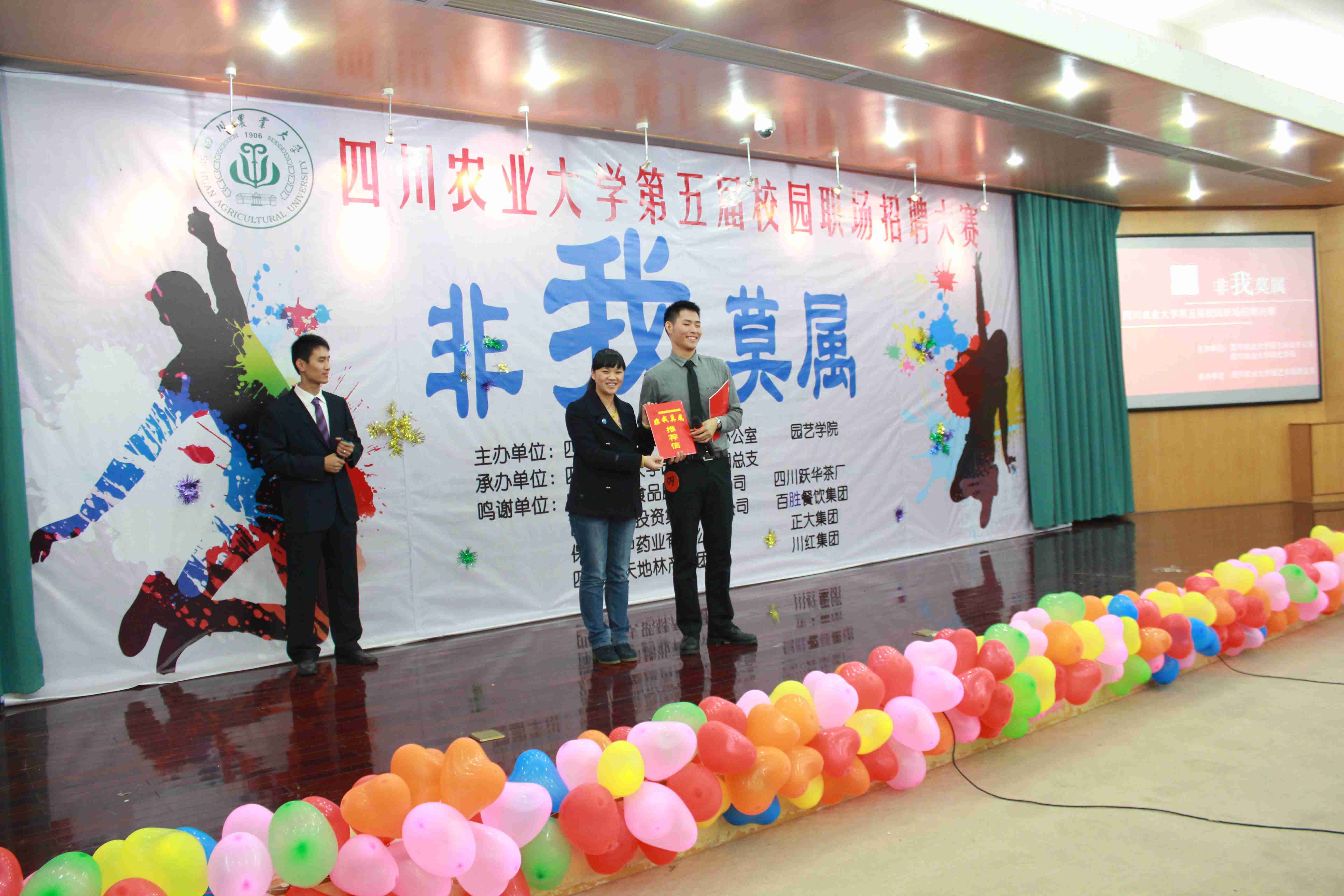 经过初赛、复赛的层层选拔,来自雅安校本部7个学院的9名选手脱颖而出获得了与企业面对面求职的机会。他们运用现代多媒体手段从“基本情况”、“应聘岗位”、“对岗位的认识”、“工作学习经历”和“自我优势”等方面进行五分钟的“毛遂自荐”,面试官则通过对选手的求职动机与工作愿景、工作态度与价值观和应变能力等方面进行现场提问。他们得体的着装、从容的态度、扎实过硬的知识掌握、精彩的现场表现得到了企业代表的认可,面试官言辞犀利的提问也给现场观众上了一堂生动的求职面试课程,最终9位选手都得到企业抛来的橄榄枝。其中,2号选手陈松是当晚备受企业亲睐的选手,他自信的表现赢得了包括正大集团、四川跃华茶叶集团等6个企业的认可,最后他和有丰富主持人经历的朱成林选择加盟正大集团,罗丹成功应聘百胜餐饮集团,方圆选择加入中粮集团团队,唯一一名大三员工李雪飞得到川红集团提供的实习岗位,本次招聘的最大赢家是中天地林产,杨海燕、王泽东和李红喜3位选手得到了他们的推荐信。9号选手卢洋“Could you mind tell us what are you special areas?”与来自特驱集团熟练的英语应聘对话将本次招聘会推向高潮,其过硬的实力在赢得企业认可的同时更征服了现场观众,他最终选择加入慧眼识他的“伯乐”特驱集团。当晚有的企业甚至在招聘结束后还对垂涎的人才展开攻势。