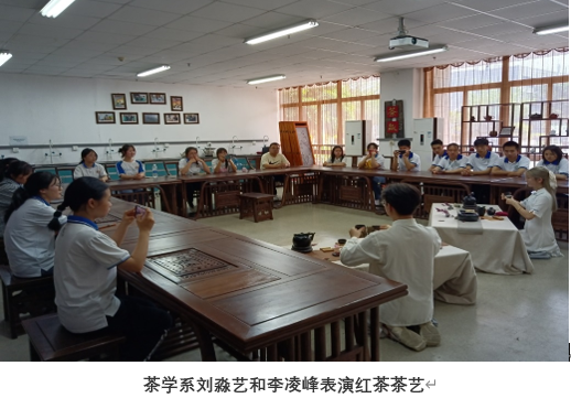 随后,来访师生观看了双人红茶茶艺表演,感受了茶艺和中国茶文化的魅力。在茶叶审评实验室,茶学系边金霖老师为来访师生讲授了茶叶审评用具,审评的标准方法和六大茶类品鉴等茶学专业知识,并让大家亲身体验了茶叶审评实验课。