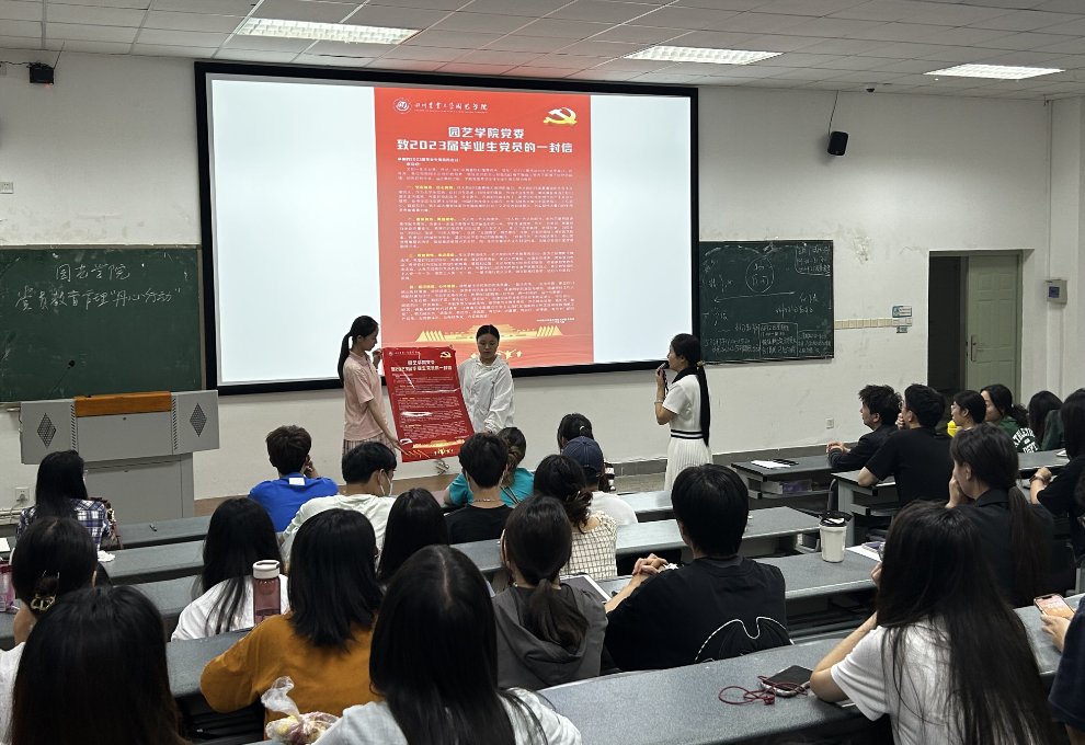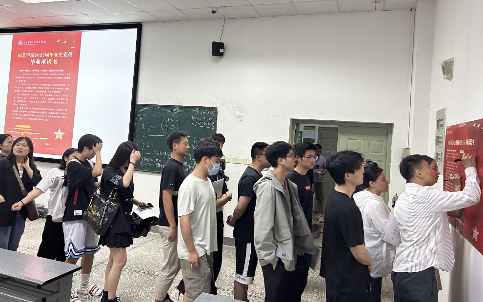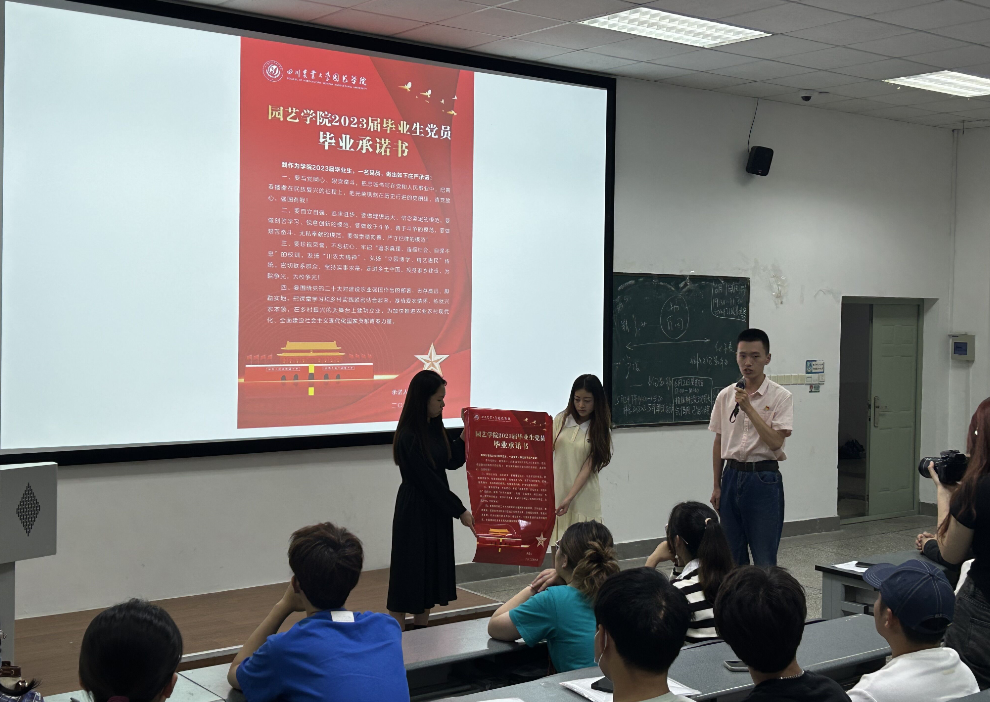随后,开展了“丹心行动”主题党日活动,袁志香带领全体毕业生党员重温了入党誓词,大家齐诵入党誓词,再扬信仰决心,发自肺腑铿锵有力的声音,向着党的殷切嘱托、向着母校的热切期盼、向着自己的憧憬梦想。紧接着,袁志香向全体毕业生宣读了公司党委致2023届毕业生党员的一封信,从坚定信念,红心向党;奋发有为,勇担使命;增强党性,牢记身份;铭记情谊,心怀感恩四个方面对毕业生党员提出要求和希望。希望每一位毕业生党员牢牢把握“学思想、强党性、重实践、建新功”的总要求,在新的征途上,不忘初心、砥砺前行、踔厉奋发,努力成长为“讲政治、有信念,讲规矩、有纪律,讲道德、有品行,讲奉献、有作为”的共产党员,为党旗添彩、为母校争光、为誓言践诺!毕业生党员代表代京桐代表全体党员作郑重承诺:一是坚定拥护党的决定、红心永向党;二是不断强化自身学习、争做优秀模范;三是牢记川农大校训、践行川农大精神;四是厚植爱农情怀,助力乡村振兴。一代人有一代人的使命,每代人都有独属的担当,作为新时代的有志青年,定不忘祖国所托,为实现伟大中华民族伟大复兴而奋斗!全体毕业生党员郑重在承诺书上签字。
