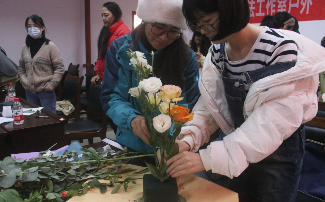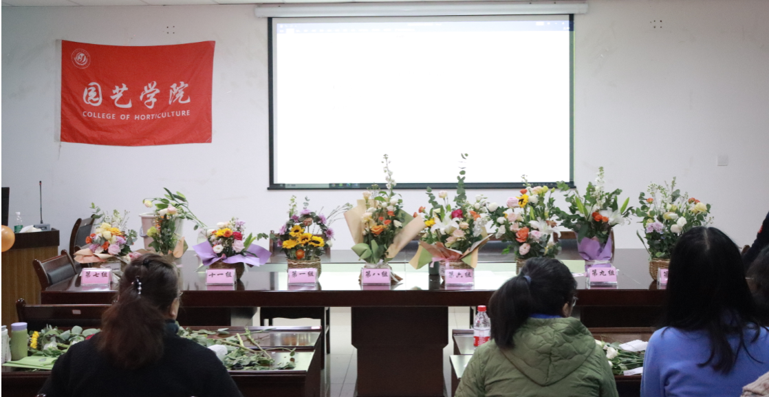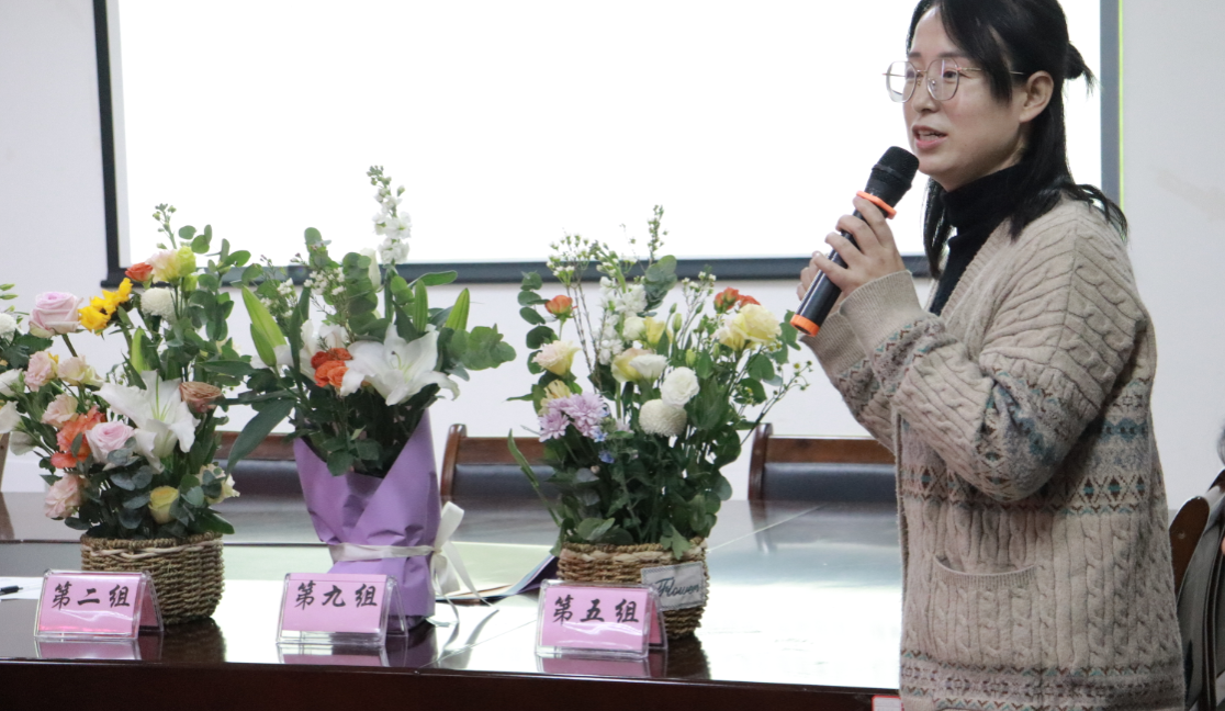 讲座结束后,开展了实践插花活动。老师们3-5人一组,指定花材现场插花。学院提供了向日葵,白百合,粉荔枝,紫罗兰,牡丹,桔梗,玫瑰,洋甘菊等多种花卉植物,张小艾也逐一介绍了它们独特的花语,帮助大家更好地创作出符合自己内心意境的艺术作品。插花完成后,各组派代表对该组作品进行讲解,包括立意,风格,选材,构图,色彩,寓意,功能特效等方面,表达自己对园艺疗法的感悟。张小艾也通过作品分析了创作者的性格特点,艺术风格,思考方式,让各位老师进一步感受到了“园艺花卉植物”与“心理健康”的奇妙联系与巧妙结合。