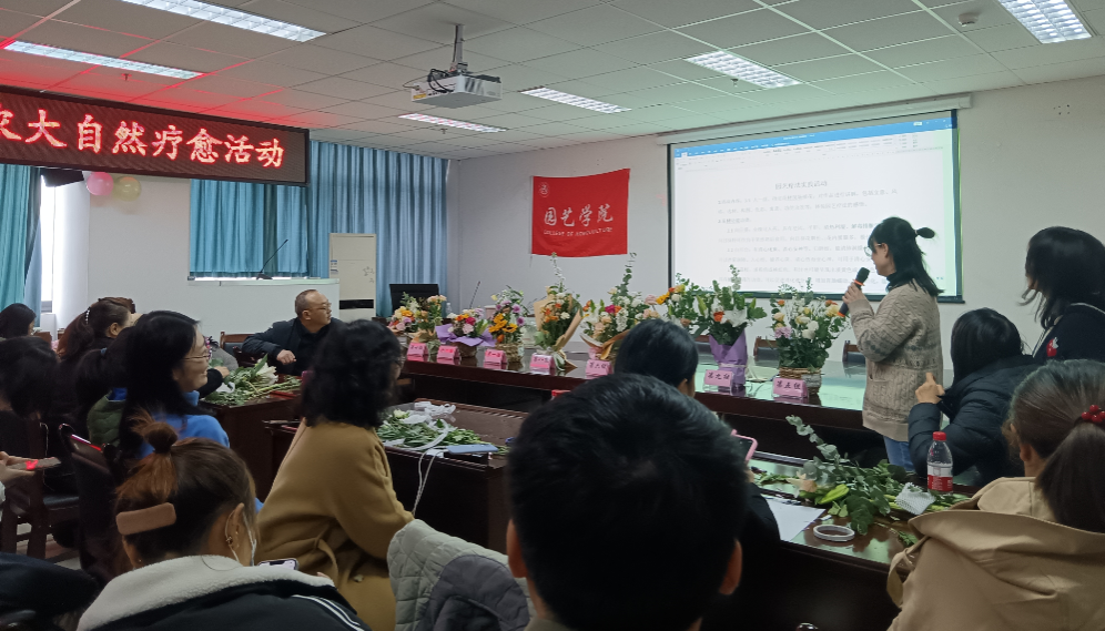 随后,团队成员、果树学系张小艾副教授为大家带来了“我与花儿共成长”讲座,内容包括园艺疗法的定义、与相关学科领域的关系及其历史与现状。张小艾向大家介绍了不同季节花卉植物的保健功能,也重点讲述了园艺疗法的发展趋势。该种心理疗法不仅在国外广为使用,在中国也历史悠久并独具特色。启发大家思考如何将园艺疗法运用到实际的心理咨询过程中去。