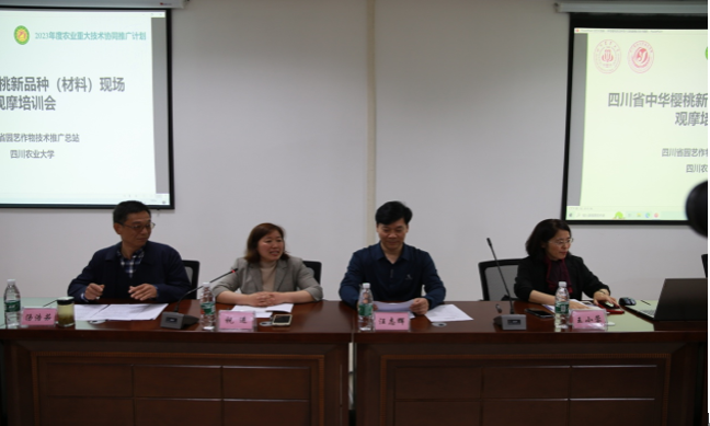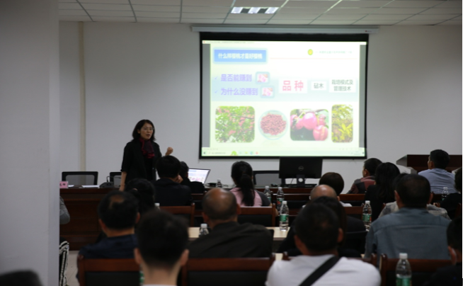 经理汪志辉教授在培训会上致辞,果树种质创新与遗传改良团队负责人、果树学系汤浩茹教授介绍了团队情况,樱桃资源四川省科技资源共享服务平台主任、四川省樱桃种质资源圃负责人、果树学系王小蓉教授围绕新品种熟期合理搭配以及品种品比试验等方面,开展了中华樱桃新品种及配套栽培模式的专题讲授。