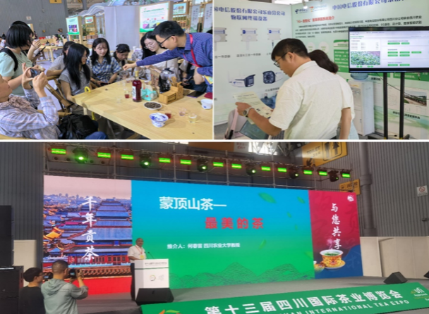 本次博览会中,茶学多项成果和产品精彩亮相。唐茜教授和四川一枝春茶业有限公司合作研发生产的“紫嫣绿茶”入选“四川最具影响力茶叶单品”,在开幕会上正式发布授牌。冰储叶春茶现场炒制、北川苔子茶形象产品“旗羌”、紫嫣茶酒、超微茶粉等公司茶学师生研发的新产品成为各展厅关注的焦点。茶学系谭礼强教授主持研发的中国电信“揭榜挂帅”项目成果“5G+数智化”智慧茶园系统在中国电信智慧农业展台专项展出。