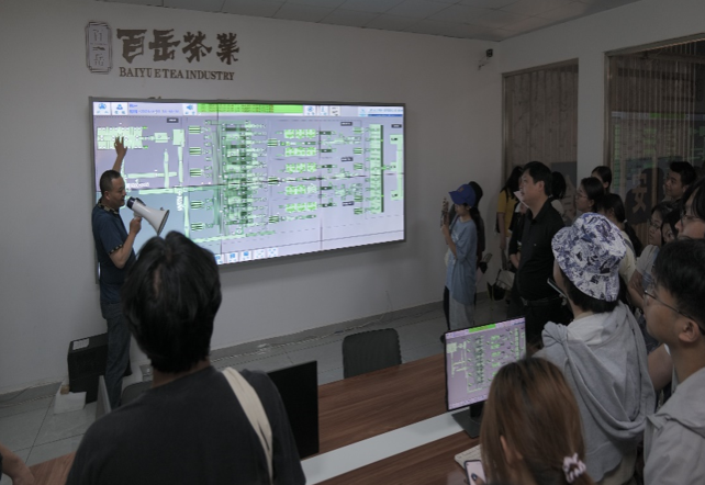 仪式前,公司师生共同参观了百岳茶业有限公司生产车间和展厅,就出口茶、饮料茶生产和市场开拓进行了沟通交流。茶学专业2021级80余名同学在四川省百岳茶业有限公司副总经理薛毅和带队老师的引导下,深入车间详细了解出口绿茶的生产环节、仪器设备和相关技术细节。