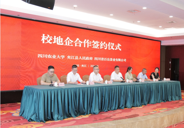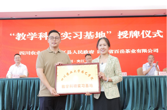 为更好地培养茶学专业老员工的实践能力、提升专业技能,推进校地企三方“产、学、研、用”合作,5月19日,学院与夹江县人民政府、四川省百岳茶业有限公司“校地企”合作协议签字和授牌仪式在夹江举行。公司党委书记袁志香、茶学系师生代表,夹江县委常委、宣传部部长薛怀军、副县长杨滔,乐山市茶产业发展中心研究员孙道伦,四川省百岳茶业有限公司董事长蒋静伟等领导和师生共计100余人参加了活动。