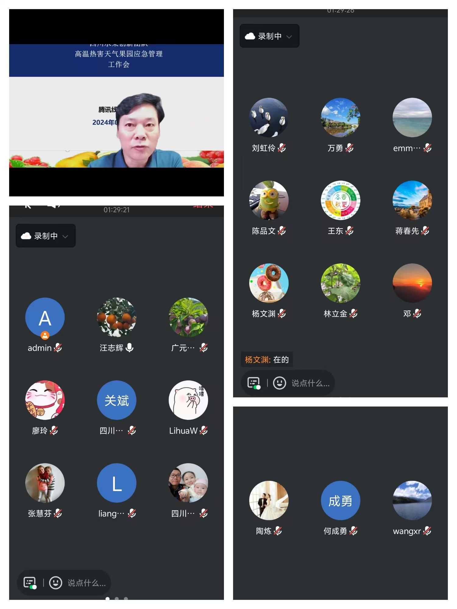 自8月20日开始,四川多地发布高温红色预警,为降低持续高温热害对我省水果产业的影响,一周来,四川水果创新团队首席专家及各岗位专家通过生产一线和电话指导等多种方式开展果园应急服务。为果园应急管理工作的推进,8月26日,四川水果创新团队通过腾讯线上会议召开了夏季高温热害天气果园应急管理工作会,团队首席专家哈哈体育汪志辉教授主持了该会议,团队专家及成员等20余人参会。