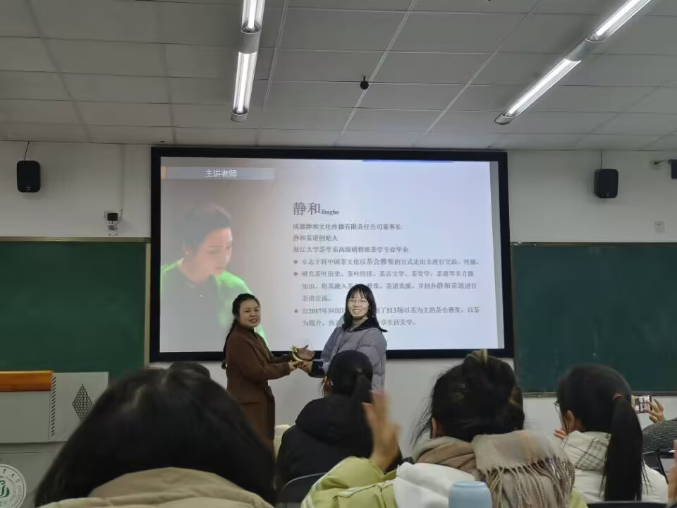 2024年12月13日下午,成都静和文化传播有限责任公司董事长、静和茶道创始人静和女士应邀到访公司,就茶产业的定位与茶学专业2022级同学开展了分享。静和女士自2016年,举办不同形式的茶文化交流和原创茶会,以茶为媒介,传递生活哲学,分享生活美学。2017年回国后,共计原创了113场以茶为主的茶会雅集,立志将中国茶文化以茶会雅集的方式进行交流、传播。