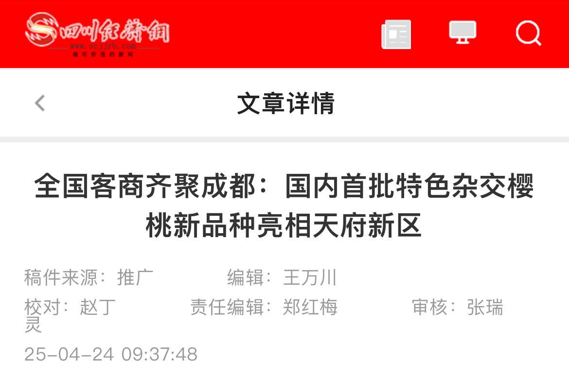此次品鉴会通过搭建“科企农”高效对接平台,充分展现杂交樱桃新品种的产业化潜力与市场价值。“一粒好种子,背后是一条产业链,更是一方百姓的致富希望。”成都种业集团执行董事周航说道,“展望未来,我们将以科技创新为引擎,以新品种规模化推广,推动樱桃产业从传统种植向高效益、品牌化方向升级,为乡村振兴和农民增收提供可持续的解决方案,让‘成都樱桃’走出西南,走向全国。”