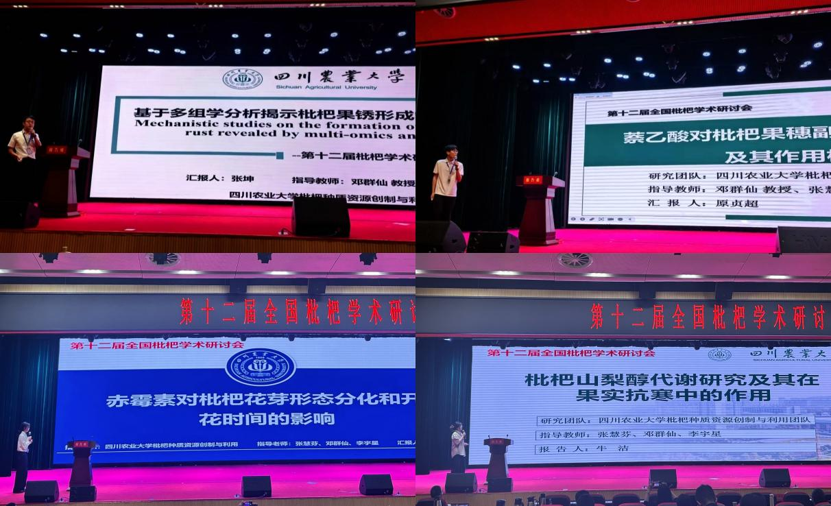 在本次学术研讨会上,枇杷科研团队的研究生们展示了多项研究成果,受到与会人员的高度关注。团队博士生张坤作题为“基于多组学分析揭示枇杷果锈形成的机制研究”的大会主题报告,从转录组、代谢组及基因调控网络的角度,系统解析了枇杷果锈的形成机制,为果实品质提升提供了理论依据。硕士研究生原贞超、汪红霞、牛洁分别以“萘乙酸对枇杷果穗副梢生长的影响及其机制”、“赤霉素对枇杷花芽形态分化和开花时间的影响”、“枇杷山梨醇代谢研究及其在果实抗寒中的作用”为主题进行汇报,报告内容为枇杷栽培与育种提供了参考。
