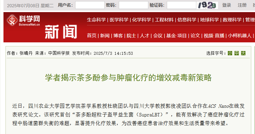 近日,哈哈体育茶学系教授杜晓团队与四川大学教授郭俊凌团队合作在ACS Nano在线发表研究论文。该研究首创“茶多酚超粒子盔甲益生菌(SupraLBT)”,能有效解决了癌症肿瘤化疗过程中肠道菌群失衡的难题,显著提升化疗效果,为改善癌症患者治疗效果和生活质量带来希望。