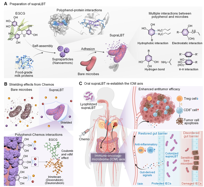 研究团队创新性地通过茶多酚(EGCG)与牛奶蛋白自组装在单个益生菌(EcN)表面,构建了一种新型的“茶多酚超粒子”单细胞包裹保护层——“茶多酚超粒子盔甲益生菌(SupraLBT)”,以期利用EGCG与化疗药物分子发生的多重相互作用力,实现对化疗药物的捕捉。这样的结构设计可使益生菌能够在强效化疗药物环境下保持活性,能有效解决传统益生菌疗法在化疗患者中存活率低的难题。